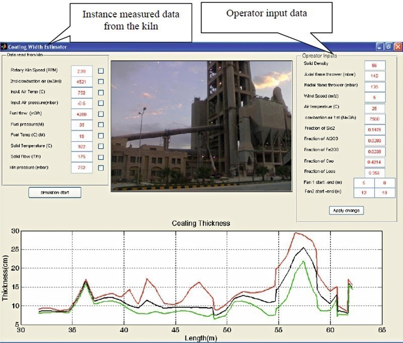 Diese Größen, wie z.B. die Temperatur der Außenfläche des Ofens, der Brennstoffstrom, Druck und Temperatur des Brennstoffs, Temperatur des festen Aufgabeguts, Menge des Aufgabeguts und Drehzahl des Ofens, werden dem Programm online aufgegeben. Um diese Daten einzugeben, werden einige Gerätesensoren und Hardware zu diesem Zweck eingesetzt.