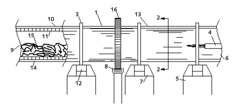 Erläuterung: Bild 2 zeigt den Drehrohrofen (1) zusammen mit den Teilen, die ihn um seine Längsachse drehen (3), (12), (8) und (16). Zum Ofen (1) gehören ein länglicher, zylindrischer, sich drehender Mantel (13), der Ofeneinlauf (9), der gegenüberliegende Ofenauslauf (6) und ein Brennerrohr (4). Der Ofen (1) wird so montiert, dass der Ofenauslauf (6) niedriger liegt als der Ofeneinlauf (9), so dass das Material (15) durch wandern kann. Es läuft durch die offene Brennzone zum Ofenauslauf (6). Der Ofenmantel (13) ist auf Laufringen (3) gelagert, die auf Stahlrollen (12) laufen, die wiederum von Betonpfeilern (5) und einem Stahlrahmen (7) getragen werden.