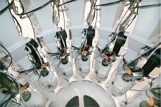 Der 12-Stutzen HAVER ROTO CLASSIC® Packer, Typ 12 RCC, ist in Bild 2 dargestellt. Zum einen ist die klassische Anordnung der Füllmodule mit der Fülleinrichtung, dem Sackstuhl und der Füllelektronik vor dem Materialbehälter (Packerkessel) erkennbar. Neu ist die Plattformkonstruktion mit selbsttragenden Füllmodulsäulen zur Unterbringung der bewährten Fülleinrichtungen mit vertikaler Füllturbine. Damit entfällt das bisherige klassische Unterteil für den ROTOPacker. Bild 3 verdeutlicht die vollständige Raumausnutzung und kompakte vertikale Motorenanordnung bei einem