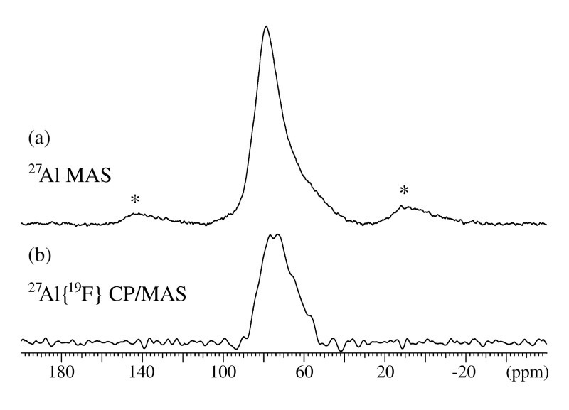 Generell ist die Kreuzpolarisation eines Qudrupolkerns (z. B.: 27Al, I = 5/2) weniger effizient als die Kreuzpolarisation eines Kernspins mit I = ½, dabei profitieren die 27Al{19F}-CP/MAS-NMR-Experimente von dem hohen natürlichen Vorkommen der 27Al-Atome (100 %) im Verglich zu dem natürlichen Vorkommen von 4,7 % für 29Si-Atome in 29Si{19F}-CP/MAS-NMR-Experimenten. Dadurch ist es möglich, die Al3+-Aufnahme im Alit durch 27Al{19F}-CP/MAS-NMR (Bild 5b) zu beobachten, was gleichzeitig bestätigt, dass ein Großteil der Fluoridionen in direkter Nachbarschaft (< 5–8Å) zu den Al3+ Gast-Ionen im Alit vorkommt. Diese Tatsache legt nahe, dass die Fluorid-Ionen durch einen doppelten Austauschmechanismus in das Alit aufgenommen werden – F- + Al3+ → O2- + Si4+ – und dies zur Clusterbildung der beiden Gastionen-Typen im Alit führen kann. Dies wird weiter unterstützt durch die Substitution von ca. 1 bis 2 % der Siliziumatome durch Al3+ Ionen sowie die eindeutige Messung der 27Al-Zentralübergangs-Resonanz in Bild 5b, welche eine beträchtliche Anzahl an 27Al–19F Spin-Paaren in der Probe erfordert.