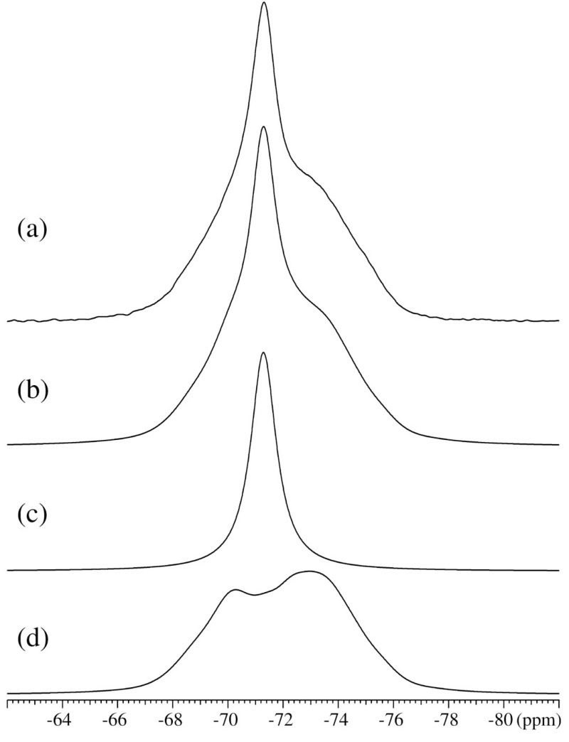 Die Form des Spektrums des weißen Portlandzementes (Bild 4a) mit dem F2-Gehalt von 0,32. Gew. % und dessen Dekonvolution (monokliner MIII-Alit in Bild 4d) zeigen, dass das Alit in seiner monoklinen MIII-Form vorliegt. Die 29Si{19F}-CP/MAS-NMR-Spektren des weißen Portlandzementes mit Fluorgehalten von 0,23, 0,47 und 0,77 Gew. % (Bild 3) weisen höhere 29Si-NMR-Signalintensitäten mit steigendem Fluorgehalt für den Bereich zwischen -66 und -78 ppm auf. Außerdem ist die Form des Spektrums aus überlagerten Resonanzen dem von MIII-Alit (Bild 4d) sehr ähnlich, während die schmale Resonanzlinie des Belit nicht vorliegt. Die vorliegenden Spektren zeigen, dass die Fluorid-Ionen ausschließlich im Alit aufgenommen wurden und dass die CaF2-Zugabe zur Gast-Ionen-Aufnahme im Alit führt.
