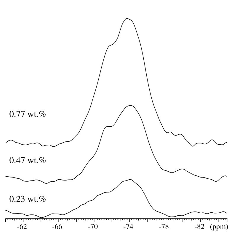 Die Erhöhung des Fluorgehaltes durch Zugabe von CaF2 zum Klinker, gefolgt von einem zweiten Brennvorgang, erhöht auch die Intensität der 19F-Resonanzen bei –115 ppm, was zeigt, dass die Fluor-Ionen in die Klinkerphasen aufgenommen wurden, da die CaF2-Resonanz bei d (19F) = –105,9 ppm liegt.