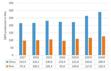 OneStone Consulting has just finished a new market study about the future of granulated blast furnace slag (GBFS) [6]. The report provides figures for the production, trade and consumption of GBFS for 110 countries, derived from the pig iron production in those countries and international trade figures. Depending on the development of the iron & steel industry, an outlook is given for 2025 and 2030. There are some industry sources which suggest that already in a few years the elimination of blast furnaces will cause the availability of GBFS to significantly decline globally. However, the truth is that the restructuring of the steel industry will come in cycles starting in W.-Europe and other developed regions before it is implemented in developing countries. As a result, BF/BOF steelmaking, which relies on iron ore, will continue to be the dominant processing route for the manufacture of steel.