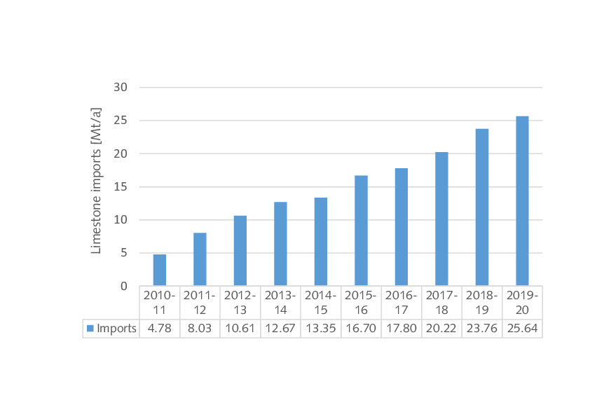 The traded quantity of limestone which is used for the cement and lime production was about 60 Mt/a in 2019. The trading value was about US$ 950 million. In the Top5 list of limestone importers were India (46.4% of global imports), Bangladesh (6.5%); Taiwan (5.0%), South Korea (4.2%) and Kuwait (3.7%). The Top5 Exporters were UAE (40.3%), Vietnam (8.4%), Oman (7.6%), Japan (7.5%) and Malaysia (5.9%) [3]. Figure 5 demonstrates how limestone imports have increased in India over the last few years. From FY 2010-11 to 2019-20 imports increased more than 5-fold, while at the same time cement production less than doubled. There are several reasons for this. Possible reasons are the limestone resources in India and their distribution, the limestone grades and eventually the state-wise auctioning procedures of limestone blocks by the Indian Mines Department.