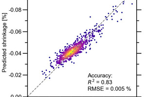 Based on the results in Figure 1, it can be seen that the ML model achieves impressive accuracy in predicting the strength, slump, and shrinkage of the various concrete mixtures, especially considering the inherent variability in the measurements and the broad range of concrete types. It can be observed that, over all the individual plots, the data points are evenly distributed along the line of equality and do not contain significant outliers. This suggests that the models do not exhibit an obvious tendency to consistently overestimate or underestimate the target property. In terms of the strength predictions from Figures 1a to 1d, their RMSE values are all around 4 MPa – this is a rather exciting observation as this prediction error is already close to the standard deviation of the concrete strength measurement (e.g., ~4 MPa vari-ation commonly reported for 30-MPa concrete) [23]. Similarly, the models also exhibit fairly high accuracies for predicting slump and shrinkage. For instance, the RMSE of the slump prediction (22 mm, see Figure 1e) is comparable to the acceptable difference between two slump measurements according to the ASTM C143 test standard (e.g., 26mm for concrete with a slump of 125 mm, based on single-operator precision) [24]. Regarding the shrinkage prediction (see Figure 1f), the RMSE is merely 0.005%. This value is also similar to the standard deviation specified by the ASTM C157 test standard [25], which is approximately 0.0045% variation for measuring concrete specimens cured in water. While there is certainly room for further improvements in the ML models, the above comparisons all imply that the model accuracy is approaching the limit that is related to the intrinsic variation of the different property measurements. The ML models seem to have outperformed alternative AI predictions, and have set a new precedent of ML-based concrete performance prediction in terms of both the scale and scope.