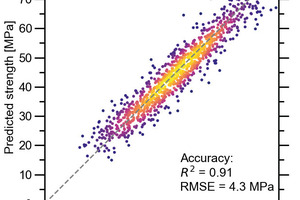 Recent advances in artificial intelligence (AI) and machine learning (ML) offer exciting possibilities for predicting the performance of concrete mix designs at higher accuracies, and, therefore, fulfilling much more efficient design optimization. AI models are particularly adept at finding patterns between input features (such as raw material proportions) and output targets (such as concrete properties). A well-trained AI model can make accurate predictions based on all the complex factors provided to the model, which cannot be easily handled by either empirical experience or knowledge-based models. In recent years, the success of predictive AI has been frequently demonstrated in high-tech fields such as autonomous driving and social media trend forecasting. Regarding the application of AI in concrete research, the use of various ML methods has also merged on the table, where a number of studies have investigated applying different techniques to predict the strength [9,10,5,6, 11-14], durability [15-16], and other material qualities of cementitious materials [19-21]. At the moment, many concrete producers have accumulated huge amounts of production data that can be used to train robust AI models for their particular cases; however, the benefits of AI are still out of reach for the majority of manufacturers. This is due to a series of reasons, which include but are not limited to the knowledge gap across the fields, lack of experience and confidence working with ML models, and the concern about the high cost of building an AI system from scratch. Nevertheless, the potential of applying AI technologies in the concrete industry is vast, and mankind is only just beginning to scratch the surface of what is possible.