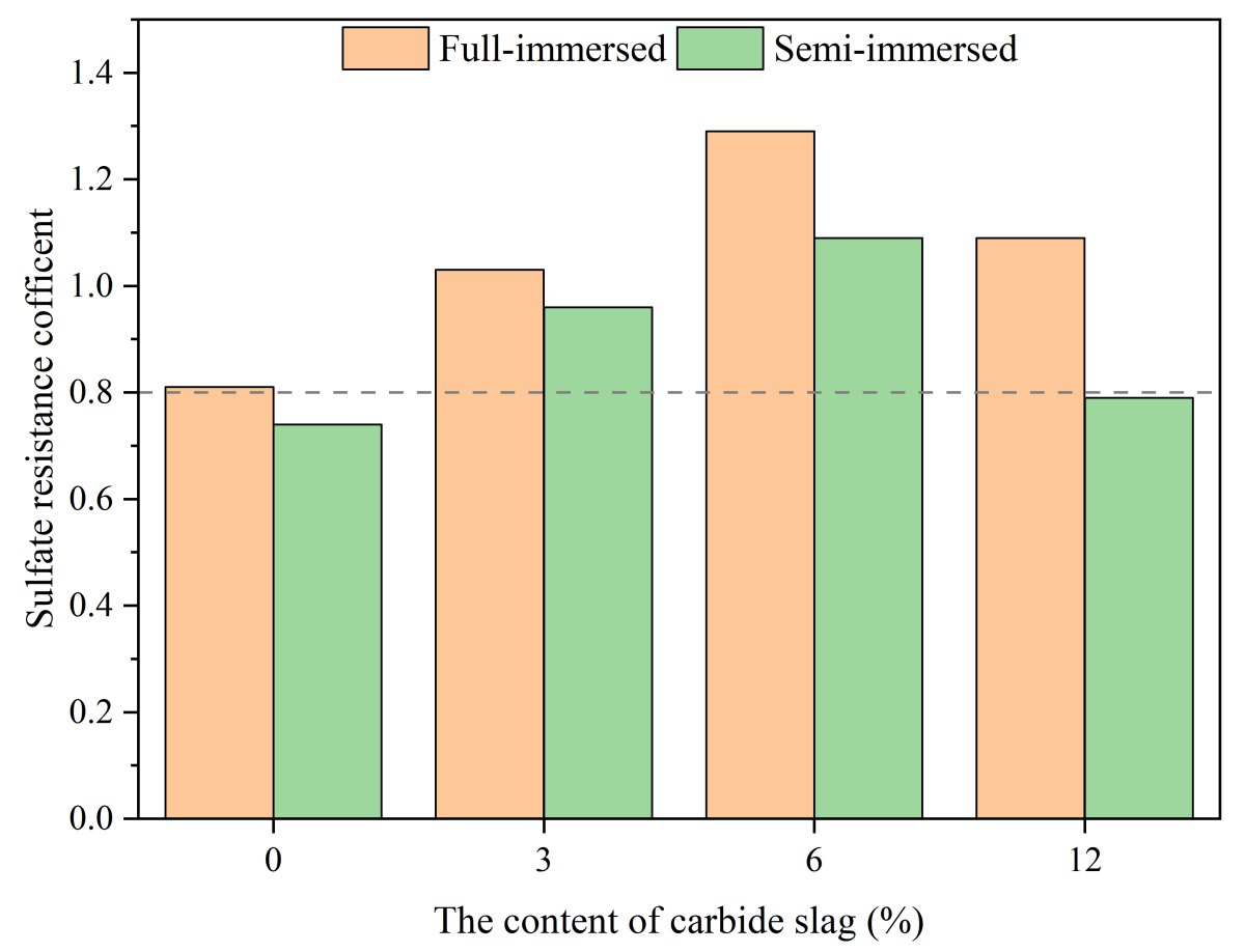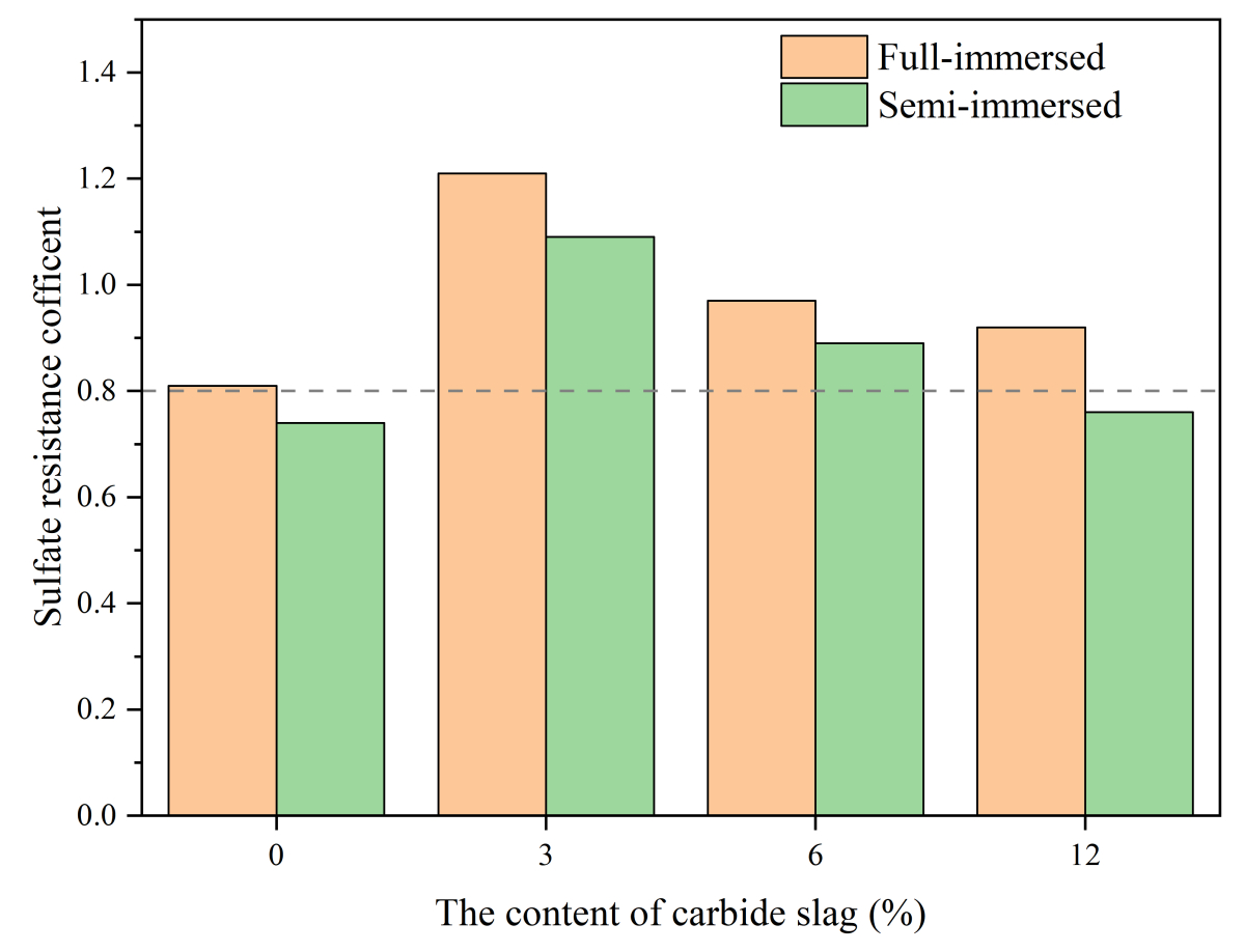 Under the condition of full immersion in sodium sulfate, as the content of CS increases, the flexural and compressive strengths first increase and then decrease. For instance, the flexural strength at 3% CS content is 17.4 MPa, and the compressive strength is 67.1 MPa, which were 42.6% and 4.7% higher than those of the specimens without CS, respectively.