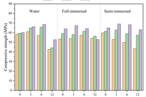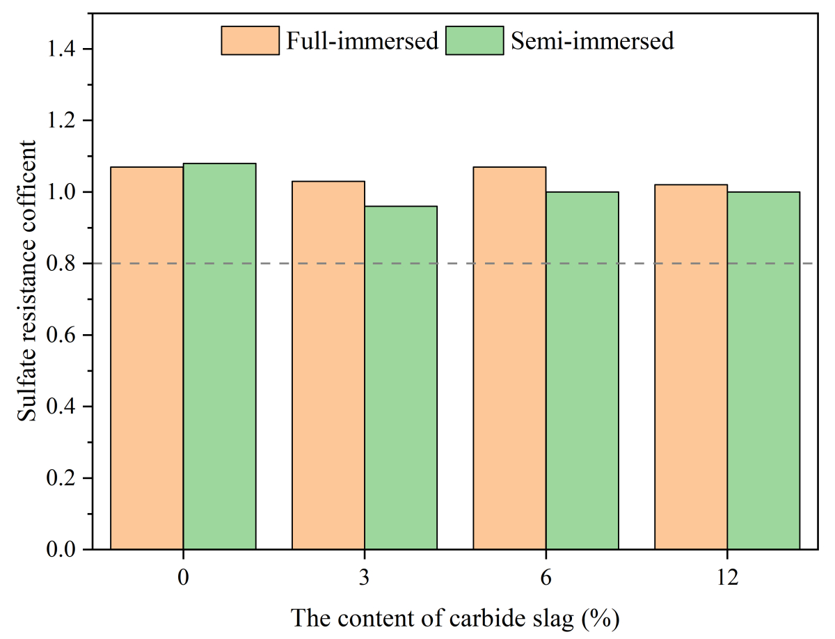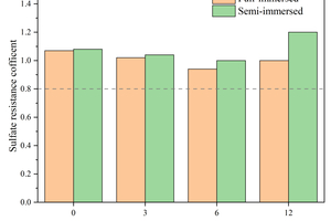 3. Semi-immersion erosion causes more severe erosion damage than full-immersion erosion. In the semi-immersion sodium sulfate attack environment, the sulfate crystallization damage caused by the “wick effect” resulted in a lower flexural strength corrosion resistance coefficient of 120 d than that of the full-immersion environment specimens.