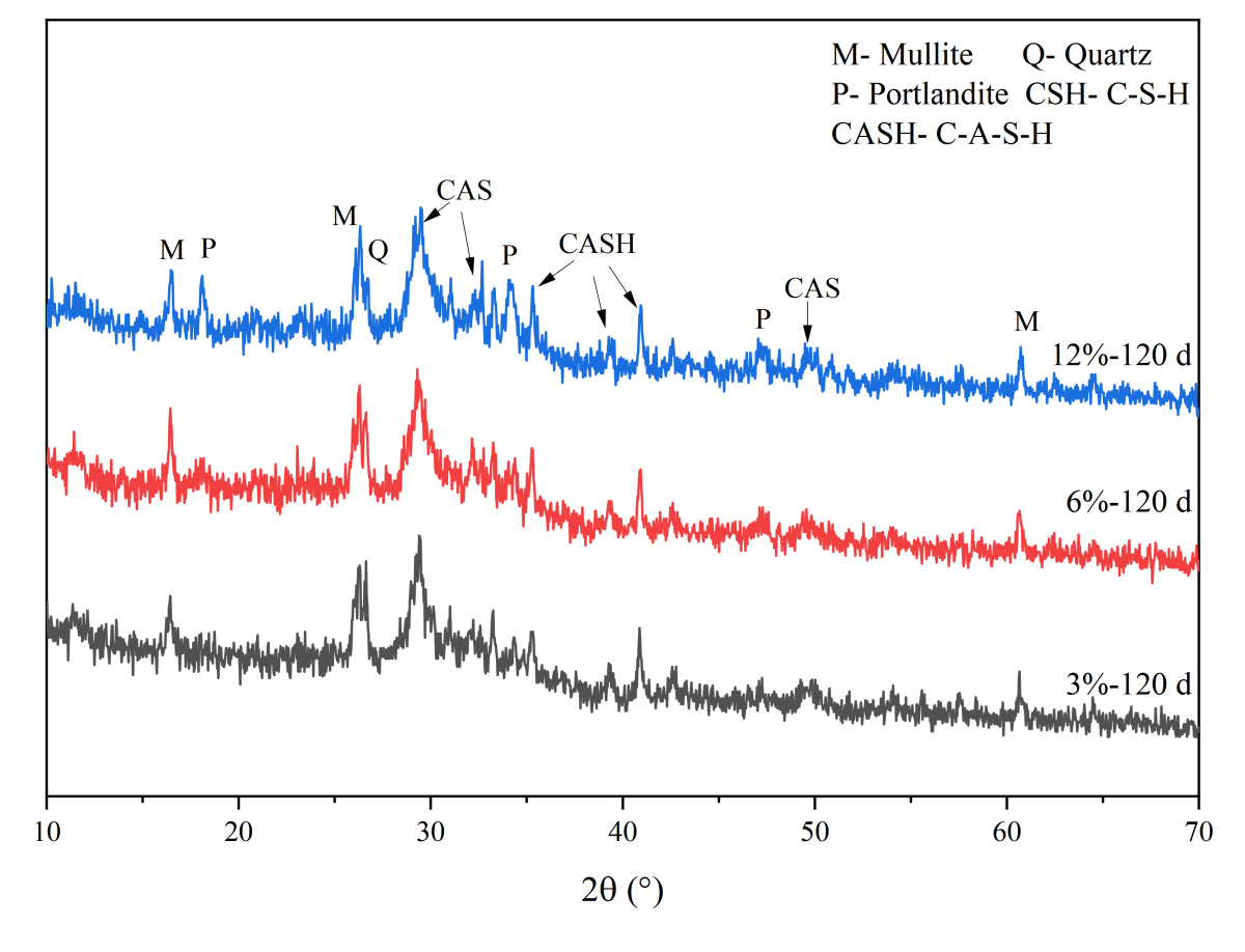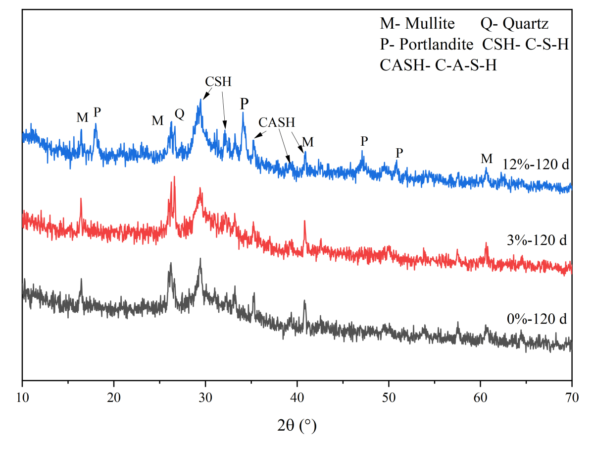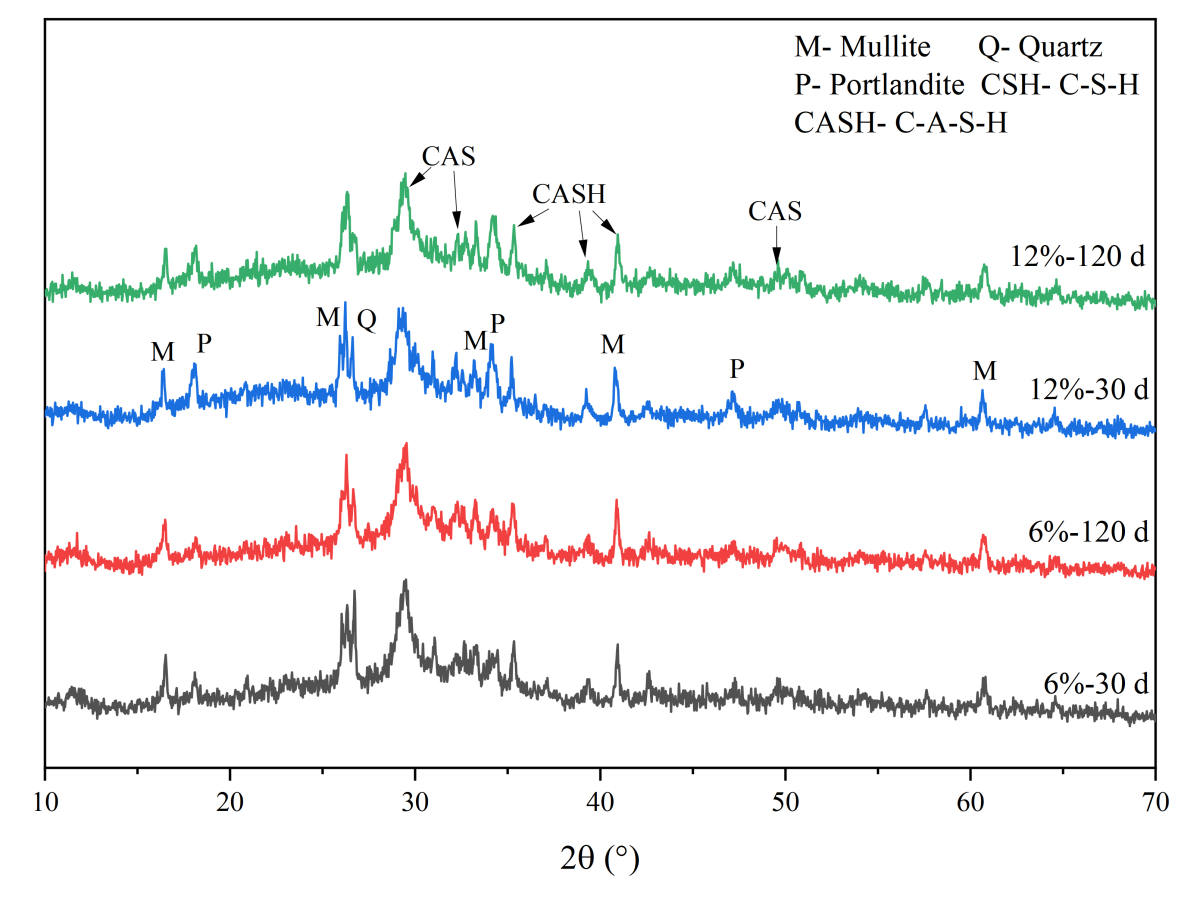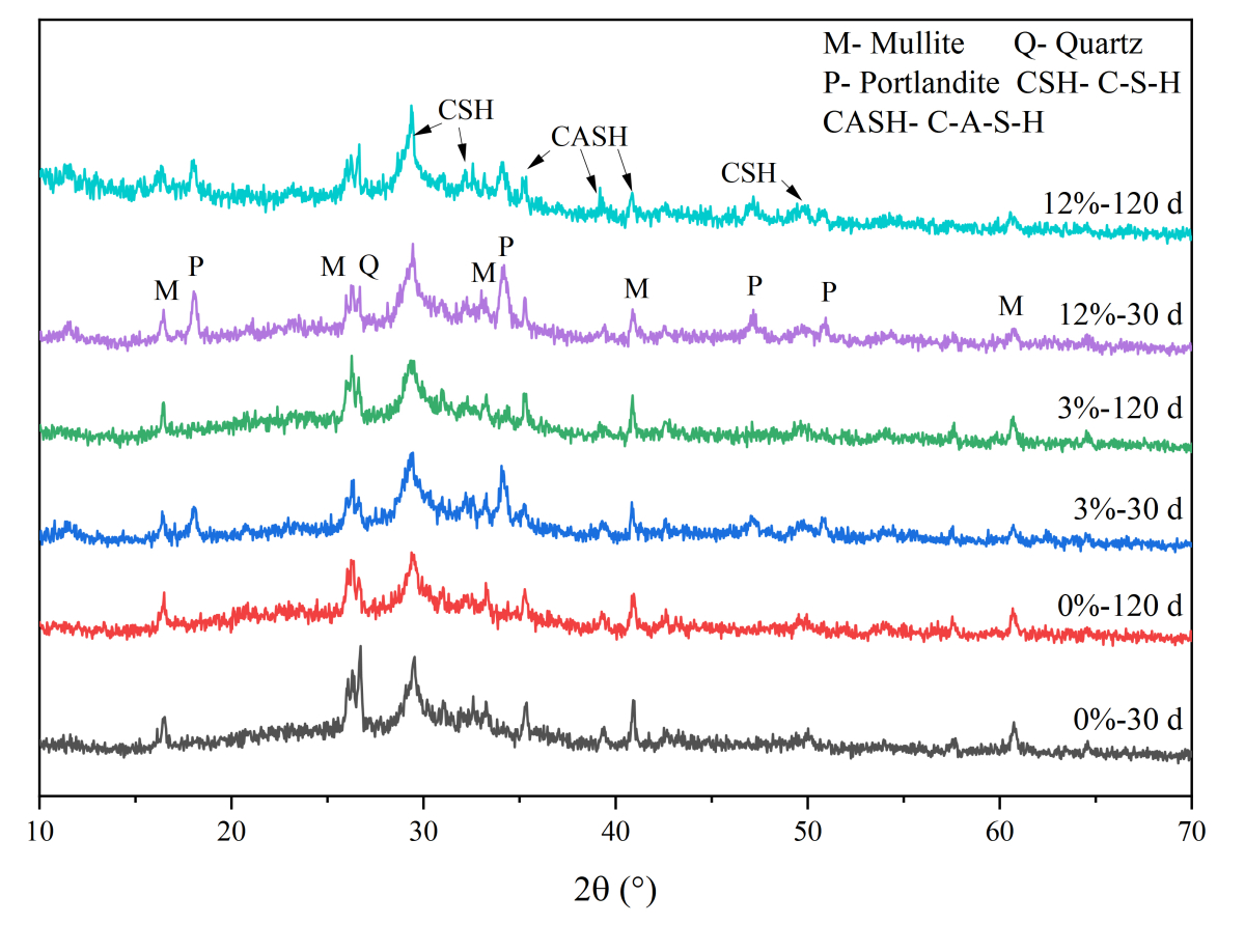 As shown in Figure 8, diffraction peaks of mullite and quartz are observed, indicating the presence of unreacted FA in the system. Additionally, a large number of continuous diffuse peaks is seen in the XRD pattern, with an obvious broad hump in the diffraction angle range of 25°-35°, characteristic of the main hydration products, C-S-H/C-A-S-H amorphous gels [24, 25]. Under the condition of water curing, prominent Ca(OH)2 (Portlandite) diffraction peaks can be observed near 18.2° and 34.2° with the increase of CS content at 30 d, which indicates that there is still a significant amount of unreacted CS in the system at this time. However, at 120 d, the Ca(OH)2 diffraction peaks of the specimen containing 3% CS are no longer observed, and the Ca(OH)2 diffraction peaks of the specimen mixed with 12% CS decrease significantly compared to the specimen at 30 d, mainly because the pozzolanic reaction of FA can consume Ca(OH)2 to produce the hydration products of C-A-S-H gels. By comparing the XRD patterns of different CS content at 30 d and 120 d, it can be found that the C-A-S-H characteristic peaks of hydration products are more intense at 120 d.