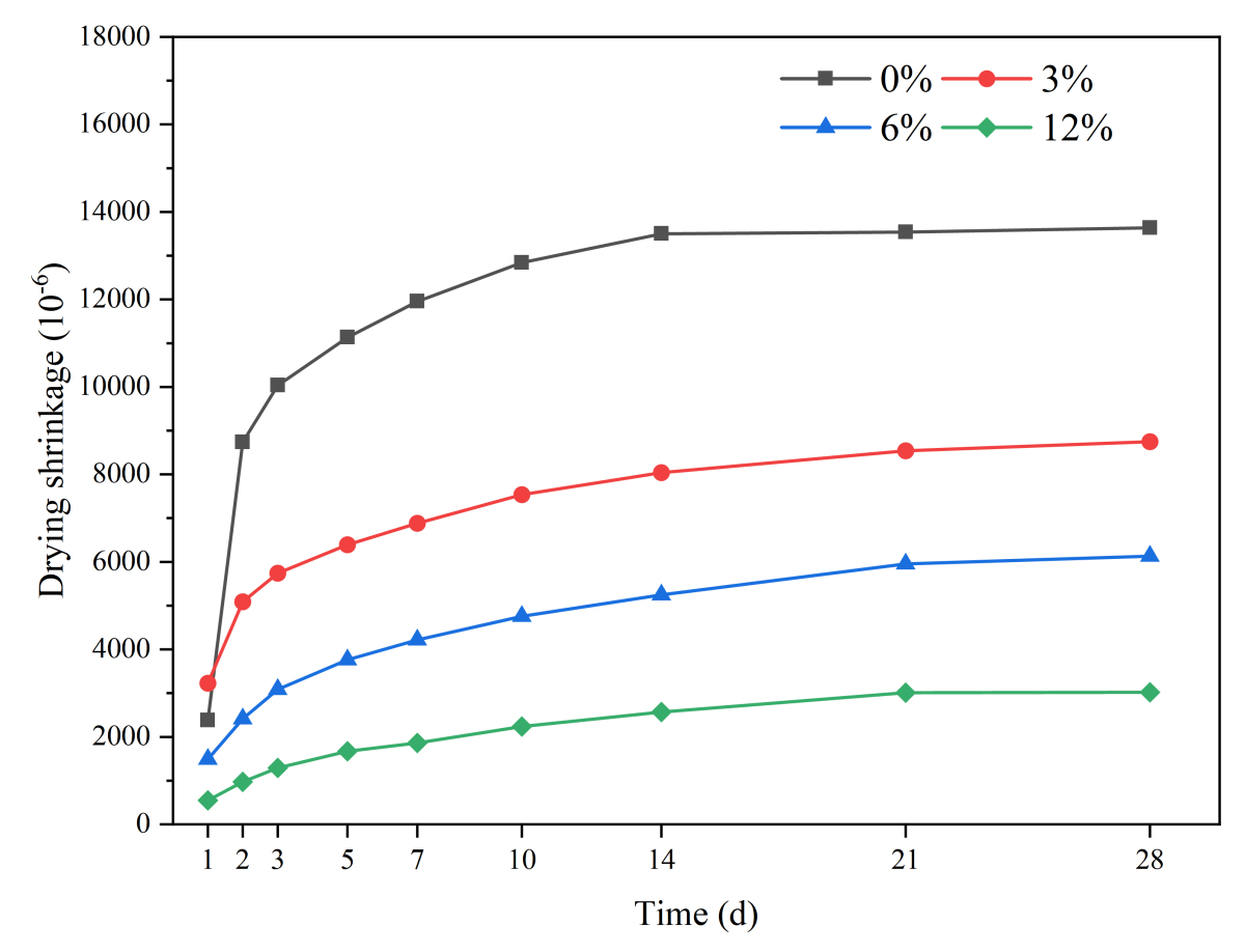 From Figure 2, it can be observed that the control group without the inclusion of CS exhibits the highest drying shrinkage, reaching 13639 με at 28 d. The drying shrinkages at 28 d for 3% and 12% CS inclusion are 9672 με and 3660 με, respectively, which are 29.09% and 73.17% lower than that of the control group. This indicates that the inclusion of CS instead of FA significantly inhibits the drying shrinkage of the specimens, which is attributed to the large amount of Ca(OH)2 in CS. Firstly, the calcium introduced by adding Ca(OH)2 increases the Ca/Si ratio of the C-(A)-S-H gel [18, 19], and the increase in the Ca/Si ratio enhances the water retention of the C-(A)-S-H gel [19]. As a result, the loss of water during drying is reduced, which decreases the drying shrinkage. Secondly, the increased presence of Ca(OH)2 crystalline phase enhances the stiffness of the specimens and improves their elastic modulus [20], thereby limiting the drying shrinkage.