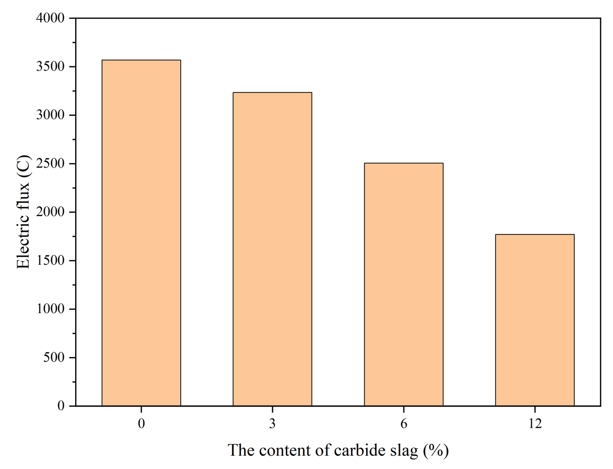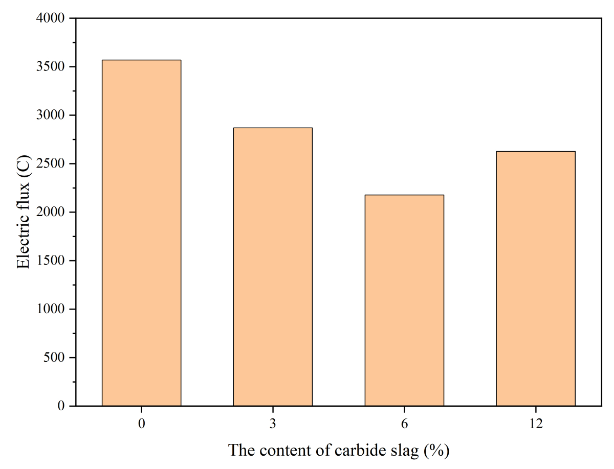 Electrical flux is a test based on electrical conductivity measurements, which is mainly influenced by the pore structure of the paste and the chemical composition of the pore solution [22]. It can be observed from Figure 4 that the increased content of CS leads to a decrease followed by an increase in the electrical flux of the specimens. For instance, when the calcium carbide slag content is 0%, 3% and 6%, the electric flux is 3567 C, 2868 C and 2178 C, respectively, showing a decreasing trend, while when the calcium carbide slag content is increased to 12%, the electric flux is increased to 2627 C. This is because the addition of CS promotes hydration, increases the amount of hydration products, refines the pore structure, and thus reduces the electrical flux. Additionally, the incorporation of CS reduces the shrinkage of the specimens, leading to fewer micro-cracks and decreased inter-pore connectivity, which also reduces the electrical flux. However, as the CS content continues to increase, the alkalinity and ionic concentration of the pore solution rise. Consequently, the conductivity of the pore solution increases, leading to higher electrical flux.