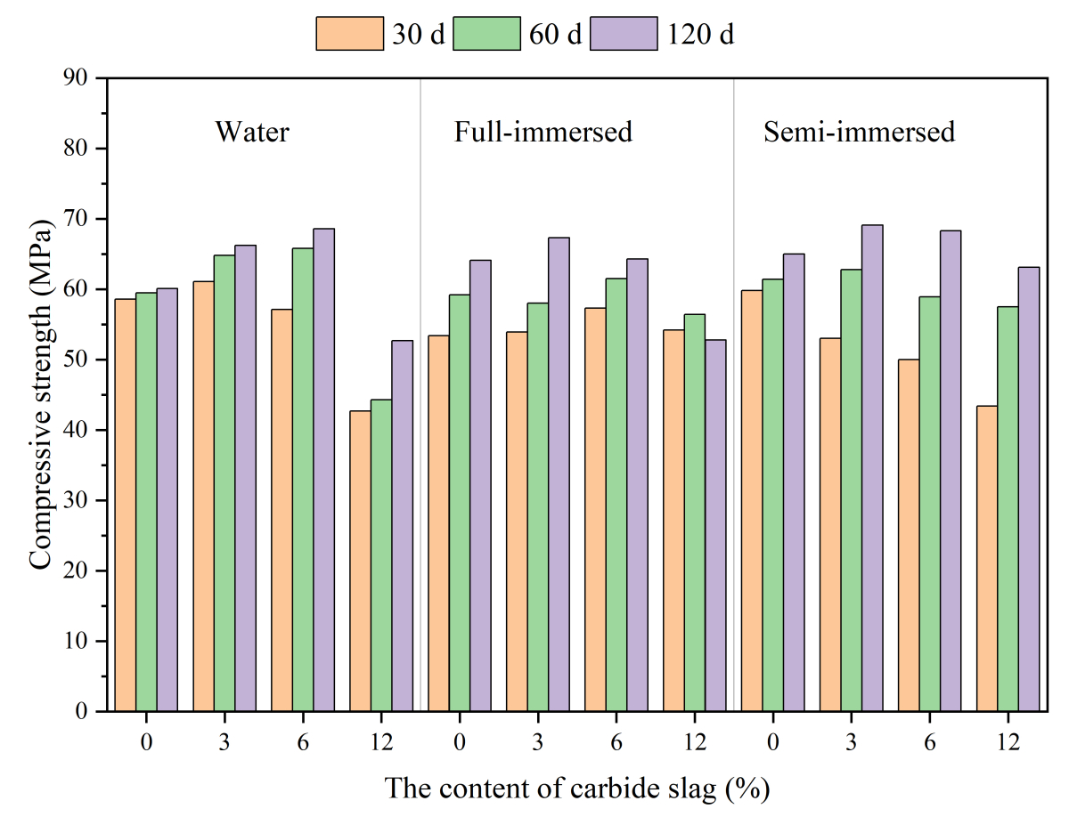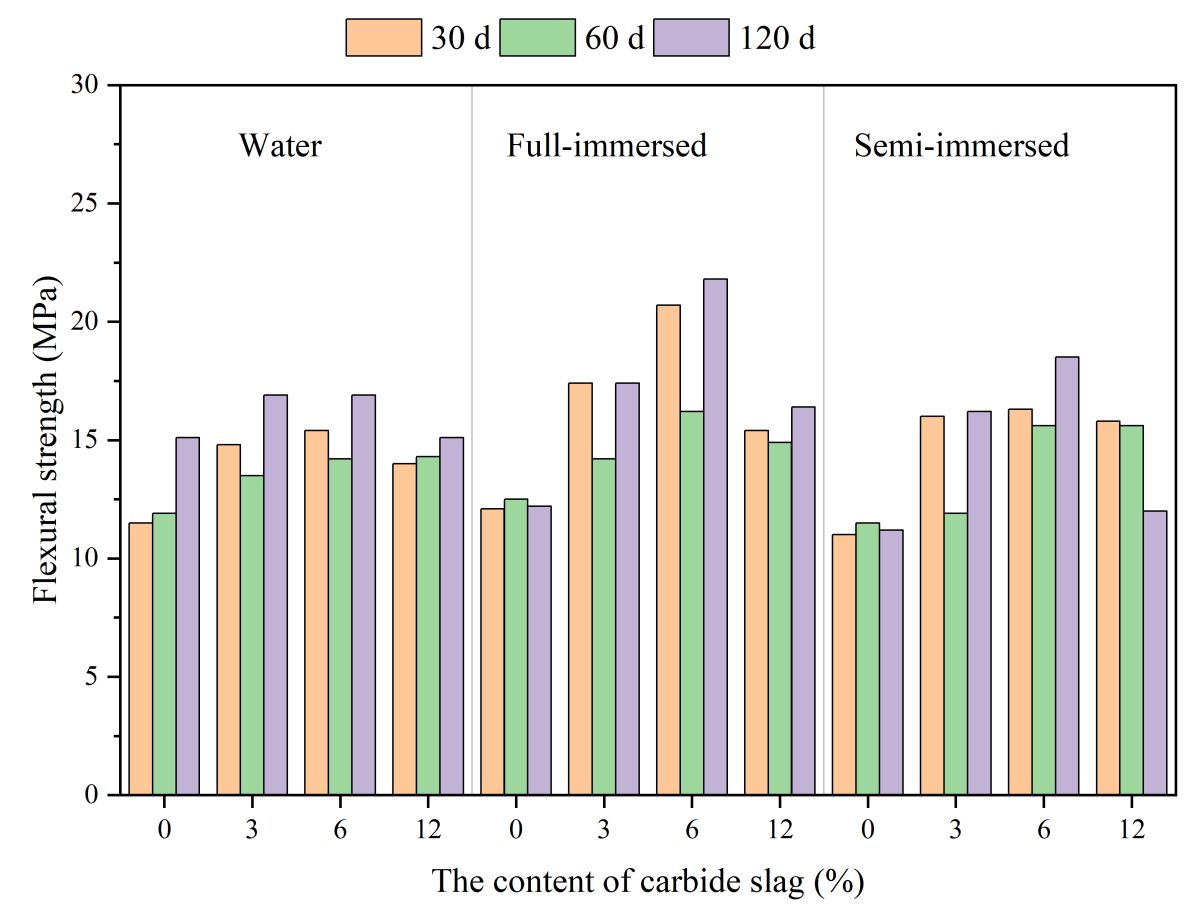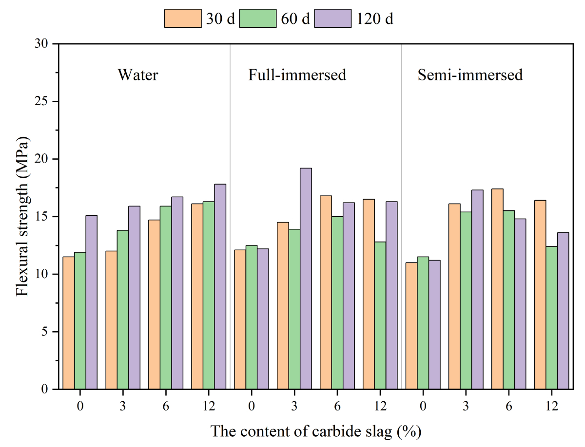 Figure 9 shows the flexural and compressive strengths of specimens with different CS content replacing GGBS at different ages after water curing, and full and semi-immersion in sodium sulfate.