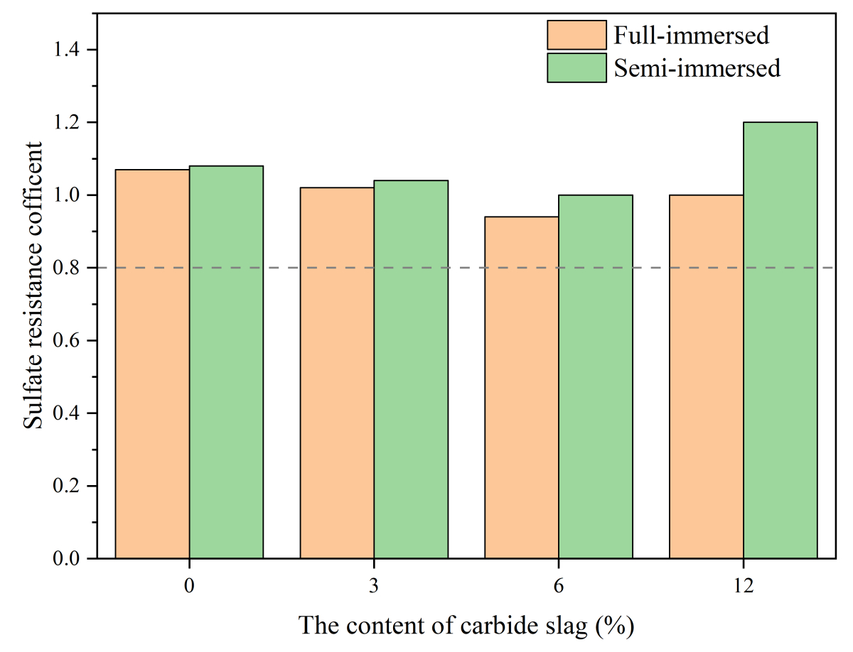 It can be seen from Figure 10 that the addition of CS can improve the flexural strength corrosion resistance coefficient. The flexural strength corrosion resistance coefficient of the full-immersion specimen without CS was 0.81, while it increases to 1.29 in the specimen with 6% CS. On the other hand, the compressive strength corrosion resistance coefficient of the specimen with CS is lower than that without CS, and there is only a slight decrease in full immersion, but the decrease is more pronounced in semi-immersion. For instance, the compressive strength corrosion resistance coefficient is 0.96 in the specimen of semi-immersion with 3% CS, which is 11.1% lower than that without CS.