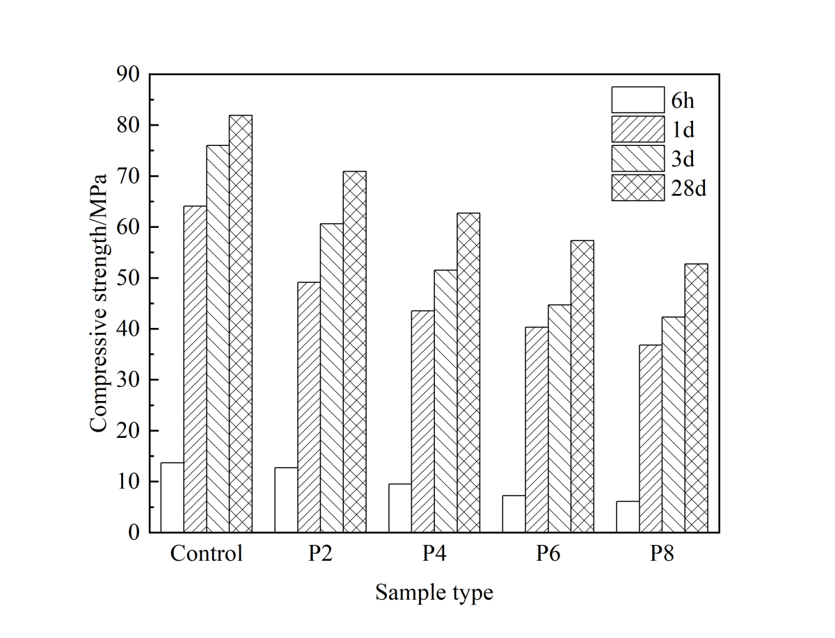 The compressive strength of the cement paste at 6 h, 1 d, 3 d and 28 d was tested according to GB/T 17671-2021 [16]. In order to eliminate as much error as possible, six specimens were tested for each mix, and the average is the result.