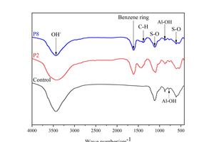 In order to study the influence of styrene-acrylic latex on the hydration phase of SAC paste, FTIR was used to compare and analyze the products of Control, P2 and P8 samples at 6 h and 28 d, and the results are shown in Figure 9.
