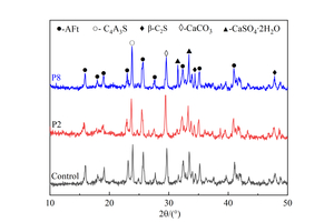 Figure 8 shows that the main phases of hardened SAC paste at different ages are ettringite (AFt), anhydrous calcium sulphoaluminate (C4A3S), dicalcium silicate (β-C2S), calcium carbonate (CaCO3) and gypsum (CaSO4∙2H2O). There are no diffraction peaks significantly different from the Control sample found in P2 and P8, indicating that the incorporation of styrene-acrylic latex would not change the type of hydration products in SAC paste basically.