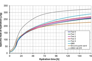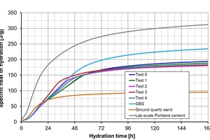For the 50/50 combinations Figure 12 (upper graphic) shows that after a hydration time of approximately 14 h the ground quartz sand only led to an intensification of the clinker peak being relatively broad due to the sulfate. The increased availability of nucleation surfaces plays a role here. A similar, somewhat less pronounced effect is evident when using smelter slag. Between the various slags no differentiation is possible. Furthermore, a significantly higher heat flow than with the ground quartz sand is evident after a hydration time of approximately 18 h. After 168 h of hydration, all cements containing smelter slag showed very similar heat development, which was significantly lower than that of the Portland cement, lower than that of the cement containing the reference GBS, and higher than that of the cement containing inert quartz sand powder (lower graphic).