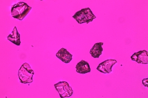 As examples Figure 5 shows the GBS being used as reference under a reflected-light microscope as well the smelter slags from tests No. 0 and No. 3. A striking feature of all DRI-containing samples is the significantly darker gray color compared to the GBS. But all smelter slags exhibited the typical glassy luster and a comparable grain size compared to GBS. As shown in Figure 6, most of all ground slag particles being used for the optical analysis of the glass content were transparent.
