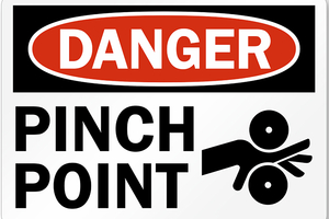 Shear points occur when the edges of two machine parts move across or close enough to each other to cut a relatively soft material. An example of this is where the belt quickly passes a stationary beam or component, which can trap a limb, abrading it or severing it.