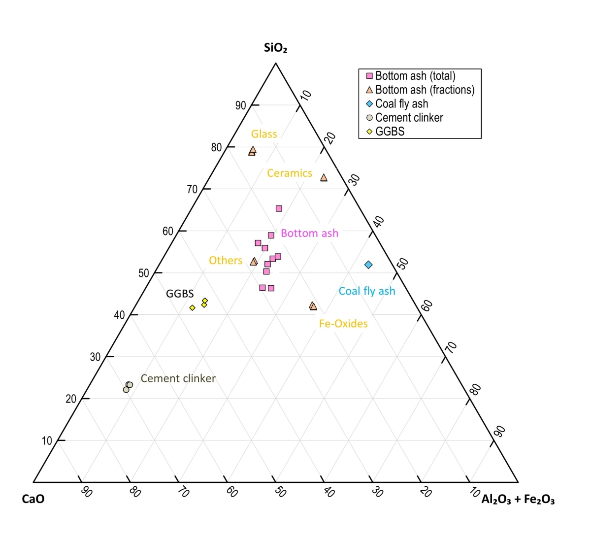 Bottom ashes are characterised by relatively lower amount of CaO (19%) and higher SiO₂-Fe₂O₃ contents (43% and 11%, respectively) than GGBSs (35-38% SiO₂, <1% Fe₂O₃).