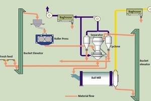 Figure 1 shows a layout of a typical cement plant with thermal and electrical consumers. Noticeably, from the figures mentioned above, one may derive that the electrical energy consumption is only 7-8% of the total energy consumed in a cement plant. Apart from being used in crushing, blending, stacking, reclaiming, kiln rotation, movement of clinker cooler parts and packing of cement, 60-65% of this high-grade electrical energy is used for grinding application in a cement plant.