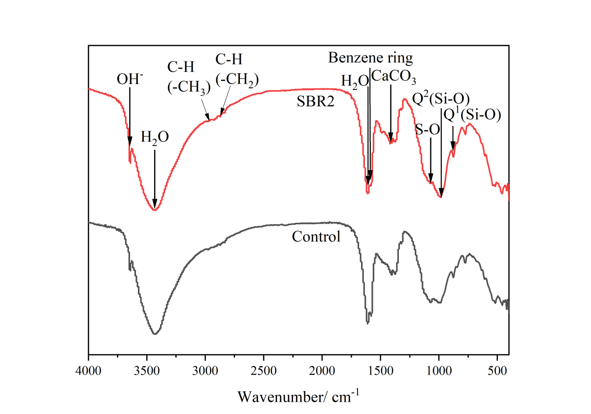 In order to further elucidate the effect of SBR incorporation on hydration products at 28 d, the FTIR tests were performed and the results are shown in Figure 4.