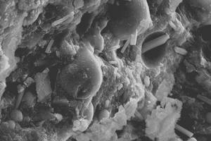 As can be seen from Figure 5, at 3 d, many fibrous and granular hydration products are present in the control sample, the overall structure is loose and there are a lot of pores between the hydration products and cement clinker. In addition, many hydration products appear on the fly ash microspheres on the surface of the control sample, indicating that the pozzolanic reaction of the fly ash has begun. The hydration products in SBR2 sample are mostly in intermediate form such as clusters and particles, and there are few lamellar gels, poor bonding between gels, and many holes and cracks. Moreover, the surface of fly ash microspheres is smooth, and no obvious hydration products are generated, so the compressive strength of the sample decreases. At 28 d, the overall hydration degree of the samples is higher than that at 3 d. Moreover, there are a large number of layered hydration products on the surface of fly ash microspheres in the control sample, which indicates that the pozzolanic effect of fly ash is very obvious, but the surface of fly ash microspheres in the SBR2 sample is smooth, showing that the reaction degree of fly ash is lower than that in the control sample. All these prove that SBR can inhibit the pozzolanic reaction of fly ash.