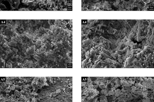 Figure 7 displays the SEM images of the hydrated clinker (3 days) sintered under different calcination atmospheres. For the sample A0, the dominant morphology of the hydration products consisted of hexagonal plate-like crystals of Ca(OH)₂ or hydrated calcium aluminate. However, with a transition from N2/O2 to CO2/O2 in the calcination atmosphere, more needle-like crystals and fibrous C-S-H gels appeared on the hydration particles. These structures interconnected, forming a three-dimensional dense solid structure that was uniformly and densely distributed in sample A1, A3 and A4. Ultimately, these structures became the primary contributors to the strength of the hardened cement. In sample A5, the hydration products were sparsely distributed, with a few long strips of C-S-H gels interspersed among loose spherical particles within the field of view. Sample A2 shows a morphology where slatted gel was present between mineral particles, indicating completed hydration.