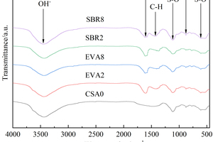 FTIR analysis was conducted on CSA0, EVA2, EVA8, SBR2 and SBR8 samples under the condition of sulfate solution erosion and curing in water for 90 d, and the results are shown in Figure 7.