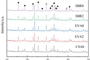 In order to study the effects of EVA and SBR on the hydration of CSA pastes under the condition of sulfate solution erosion and curing in water for 90 d, five samples of CSA0, EVA2, EVA8, SBR2 and SBR8 were selected for XRD analysis, and the results are shown in Figure 6.