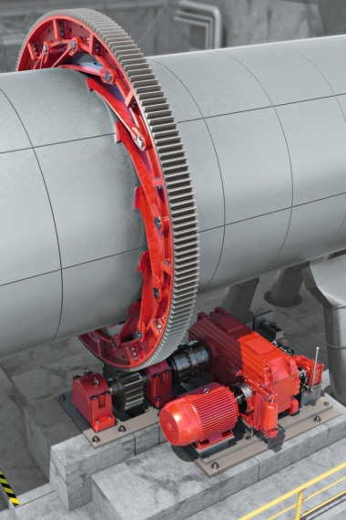 At the heart of production is a rotary kiln with a diameter of 4.2 m, in which the clinker is fired at high temperatures. Its rotation is achieved by a ring gear, which is driven by a powerful drive system. An asynchronous motor provides around 350 kW for this purpose, which is transmitted via an industrial gear unit. This is connected via a coupling to a separately mounted pinion that engages with the ring gear and transmits the required torque. The connection between the ring gear and the kiln shell is made via leaf springs, which enable a flexible yet robust coupling.