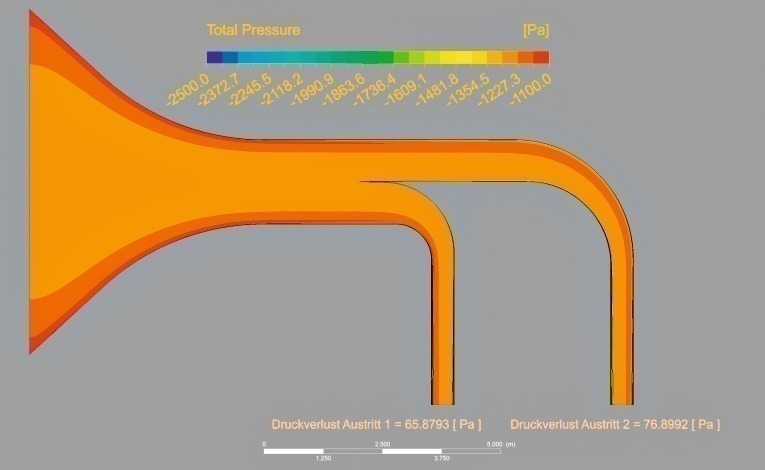 In addition to optimization of the fan itself, the upstream and downstream flow situations are of great importance for the troublefree operation of the fan and achievement of the maximum possible efficiency. If, for instance, the incoming flow is turbulent or swirling because of poorly designed bends or changes in cross-section, this inevitably results in a worsening of the fan‘s operating characteristics. Disturbances in the inflow and outflow zones have particularly serious effects in the case of fans with especially high efficiency levels > 80 %, as such fans depend on a non-swirling inflow in order to achieve their efficiency figures. As well as aiming at optimizing the fan impeller and casing it therefore makes absolute sense to analyse the inflow and outflow situations. This application is therefore concerned with the optimization of the induced draught flow of a double-inlet fan. Figure 17 shows the system arrangement drawing. The 3D model derived from this drawing is shown in Figure 18. The very conspicuous sharp-edged transitions are very detrimental to the achievement of smooth flow guidance. This becomes plain in the subsequent evaluation of the flow simulation (Fig. 19), which reveals extensive flow disruption in the rear area that is also unstable, i.e. it oscillates between the left-hand and right-hand sidewalls and thereby obstructs a portion of the branching-off rear induced draught flow. The pressure drop of this system is correspondingly high, as is illustrated by the total pressure profile shown in Figure 20. From the inlet until the end of the first branch the pressure drop is approx. 260 Pa. From the inlet until the rear branch the drop even reaches 430 Pa because of the flow disruption at the rear of the horizontal duct, as shown in Figure 19.