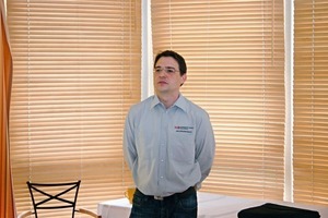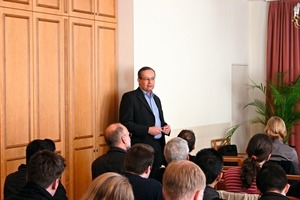 After the presentation of the works, Jens Breidenbach, process engineer from KHD Humboldt Wedag GmbH, Cologne/Germany, talked about the profile of requirements of a turnkey plant construction company. Breidenbach, who works in the Pyro Process Engineering division of KHD, said at the beginning that the company had established good contacts during the last students excursion that still exist. Jens Breidenbach was supported by Corinna Bergemann, marketing manager EMEA/Russia at KHD. KHD offer plant equipment and engineering from the quarry to the packing plant. About 55 % of the plant equipment come from their own company, the rest will be purchased. Plant sections that can be designed with KHD equipment are, amongst others, raw material grinding, the pyro-processing system as well as finish grinding. In particular Breidenbach explained the processes in the core fields of KHD, e.g. the cyclone preheater operating according to the counterflow process. A special design of the highly efficient cyclones leads to a low pressure loss. The KHD precalciner can be supplied in various designs according to the requirements of the customer, for example, as an emission reducing LowNOx calciner or as a combustion chamber calciner - another, very flexible alternative for the combustion of at times even lumpy substitute fuels. The product portfolio of KHD includes two burners, the Pyrojet® and the Pyrostream® burner with capac-ities of up to 250 MW and lining lengths of up to 12 m, as well as two modern and efficient clinker coolers, the Pyrofloor® and the Pyrostep® units.