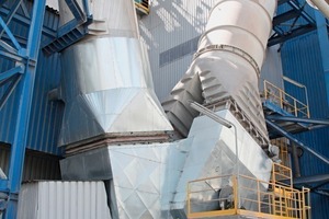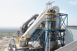 In 1996 it was decided to modernize line 5 by means of a conversion from the wet to the dry process. Within the framework of this modernization the preheater tower was rebuilt (Fig. 3), a vertical roller mill, type MPS 4200, from Gebr. Pfeiffer AG as well as a pendulum cooler from the company IKN were installed. Thus, the capacity of the kiln was increased from 1500 to 2700 t/d and heat consumption was reduced to a level of approximately 780 kcal/t. The modernized line was commissioned in 2000. In 2007 the upgrade of line no. 6 was started. The aim was to increase the capacity to 3000 t/d with a heat consumption of approx. 750 kcal/t. The following new equipment was installed: a vertical roller mill, type MPS 4250, from Gebr. Pfeiffer, an IKN pendulum cooler, an ESP from ELEX and a cooling tower from the company Lechler. In 2009 the line was commissioned.