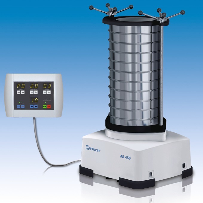With the analytical sieve shaker AS 450 control (Fig. 1) RETSCH have designed their first siever for 400 mm and 450 mm sieves which operates with a three-dimensional sieving motion. It can be used for dry and wet sieving. The optimized electromagnetic drive allows for an amplitude of up to 2.2 mm which renders the separation process much more effective than with other sieve shakers of this type. Reproducibility plays an important role: The amplitude - which is independent of the sieve load - is continually adjusted. The three-dimensional sieving motion allows the sample material to move equally over the complete sieving surface. This results in high load capacity, extremely smooth operation and short sieving times with high separation efficiency. When it comes to operating comfort, the AS 450 control meets all the requirements of a modern laboratory. All parameters such as amplitude, time and interval are digitally set, displayed and controlled. It is possible to store up to 9 parameter combinations for routine tasks.