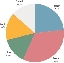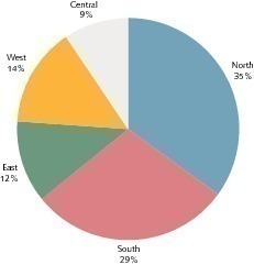 In India itself, the regions have shown greatly differing growth rates. Figure 4 compares the cement sales for the country‘s regions in two selected months, each related to the corresponding month of the preceding year. In the two periods of time, the growth in cement consumption shifts in the direction of the North and Central Indian regions, while the South and East Indian regions have a rather low growth. One indication of the regional cement deliveries can be obtained by combining the demand region (ordinate) with the dispatching region (abscissa) of Figure 5. This reveals which dispatching region provided the consumed cement. Traditionally, for instance, some of the cement produced in the North goes to the West and Central regions, some of the cement produced in the Central region goes to the Eastern region. The only “self-provider” is the Southern region.