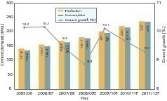 In the fiscal year 2009 (calendar year 2008/2009), cement production in India rose by 7.8 % to 181.4 Mta (million tonnes per year) in spite of the worldwide economic crisis. These figures do not include the cement output of mini cement plants. Cement consumption increased in 2009 by 8.9 % to 178 Mta (Fig. 1), this figure containing the imports but not the cement output of mini cement plants, which was about 6.2 Mta. Correspondingly, the calculated per capita cement consumption was 153 kg, or 159 kg if mini cement plants are included. This difference should be kept in mind, because the data published in other sources for India‘s cement consumption and cement dispatch differ greatly, in some cases because the calendar year is used instead of the fiscal year (FY). India is expected to have approximately two-digit growth in the coming years; the figures stated in this report are on the conservative side compared to those of local sources.