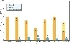 Figure 3 shows the development of the Indian cement industry‘s imports and exports. It shows a drop in exports from 6.0 Mta of cement in FY 2006 and FY 2007 to approx. 3.2 Mta, because the export ban was upheld at least until the middle of December 2008. In contrast, imports rose in FY 2008 to 0.9 Mta, 78 % of which came from Pakistan alone. In FY 2009, however, the imports of Pakistani cement had again fallen to 0.67 Mta, despite the fact that no import duties were levied. A further reduction is expected for this year. On the other hand, exports increased strongly again in this year, approximately reaching their old level. This will presumably continue for one year until the increasing self-sufficiency of present importing countries causes cement exports to decline.