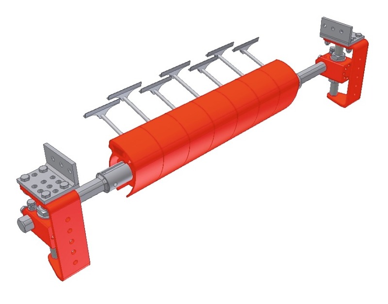 The latest developments in REMA TIP TOP belt cleaning, the REMACLEAN HM-U7 and HM-U8 (Fig.), represent a new generation of patented belt cleaning scrapers. These are precision cleaners fitted with hard metal scrapers and highly effective kinematics. The hard metal scrapers can move in two dimensions and are self-adjusting to fit the conveyor belt surface. The scrapers overlap, thus guaranteeing 100 % cleaning. The hard metal scrapers are mounted in polyurethane feet. Sleeve bearings and shaft seals ensure correct functioning. The polyurethane feet have a special function: they store the pre-tensioning force of the cleaner, and ensure that the hard metal scrapers always have the optimum contact pressure. This permits gentle cleaning by the scrapers and, at the same time, high cleaning performance. The REMACLEAN HM-U7 and HM-U8 can be used for many conveyor belts and are currently available for belt widths of 500 to 1800 mm.
