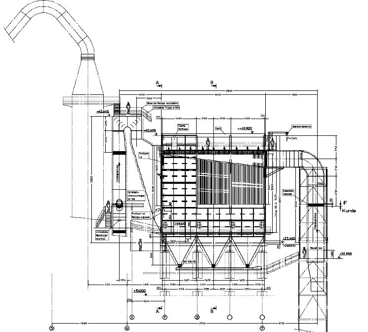 line 2, a cost-effective option with the further use of the old electrostatic precipitator housing, the dust collection hopper and the dust discharge system was chosen. The roof of the electrostatic precipitator housing and the interior were removed. In order to mount the filter heads, a new frame construction was welded into the interior of the housing shell.