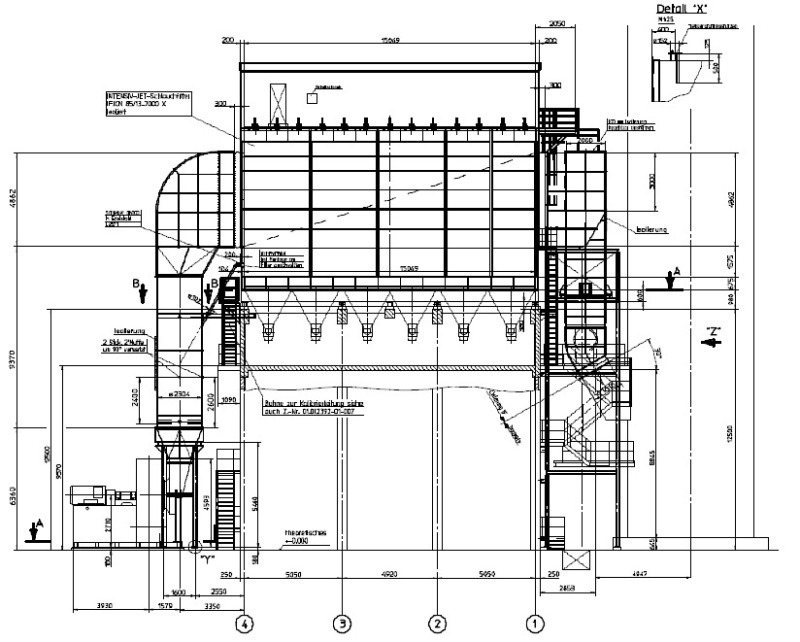 With conversion concepts, the question often arises as to whether the new clean gas area should be placed in the interior of the existing electrostatic precipitator housing or on top of it. This decision is tied to the amount of gas to be filtered, the size of the existing electrostatic precipitator installation and the maximum length of the filter bags.