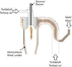 In these combustion chambers a zone is created in the upper section of the cylindrical core area, in which the fuel can ignite with the largest possible amount of oxygen and at the highest possible temperature. In order to allow the use of fuels that are difficult to ignite, meal should be prevented from entering this zone because of the endothermic nature of the decarbonization process. In this zone, the generation of an open flame is required. However, at the same time the walls of the combustion chamber have to be protected against the resulting high temperatures, and for that reason they are screened from the flame radiation by a curtain of meal. This meal curtain is usually created by  several tangentially-introduced streams of tertiary air containing the meal. This design of combustion chambers thus does not implement the principle of closest-possible proximity of heat source and heat sink. It is therefore clear that the decarbonization of the meal is more heterogeneous, because the individual particles are exposed to different radiation and heat influences. In order to assure achievement of the required degree of precalcination, these combustion chambers are often operated at higher temperatures than normal, which can, however, lead to problems with local overheating.