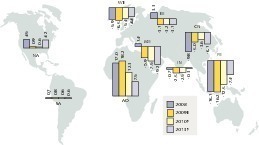 The past and future per capita consumption figures (PCC in kg) form the basis for predicting the cement consumption figures in the market study. On the one hand, the relationships between gross national product, economic growth and PCC are relatively well known and on the other hand there are some relatively accurate assessments of the future economic growth (International Monetary Fund) and of future population growth (Population Reference Bureau). One result of these analyses from the market study is shown in Figure 2. This shows how the PCC will change from 2008 to 2013 for the nine regions being examined. The only region with negative growth is Western Europe. The largest percentage growths will occur in India, China, the Middle East and Africa/Oceania. From this it is already possible to deduce various consequences for the cement industry.