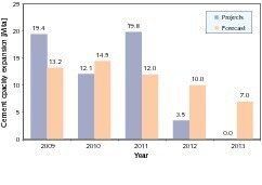 In a recent study 39 cement plant projects with planned commissioning dates in the period 2009 to 2012 were identified [1]. The production capacity of these projects totals approx. 55 Mta. Figure 17 presents an overview of the cement projects up to 2013 according to the actual project planning and according to the OneStone forecast. OneStone established that only 13.2 Mta of new capacity went into operation in 2009, because various projects had to be postponed and other projects were not completed on schedule in that year. Among the plants actually completed are Binh Phuoc (2.0 Mta), Hoang Thach 3 (1.2), But Son 2 (1.4), Ha Long Grinding (1.25), Thang Long Cement (2.3), Dien Bien Cement (0.4), Xining Cement (1.5) Dong Son Cement (1.5) Quang Son Cement (1.5) and Song Thao Cement (1.0).
