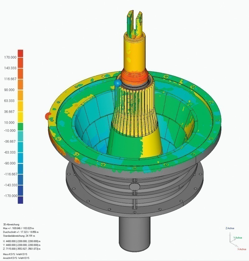 Figure 2 shows the 3D analysis of a crushing cone, made in october 2009 at a customer’s site by means of 3D scanning. The wear grades of the component are marked by the software with different colors, thus providing a precise variance comparison and an exact forecast of the remaining service life. In this case, two hours of contactless measuring helped the customer to get more planning reliability without dismantling of the crusher, avoiding longer system downtimes. To provide an even more precise measurement at lower distances,