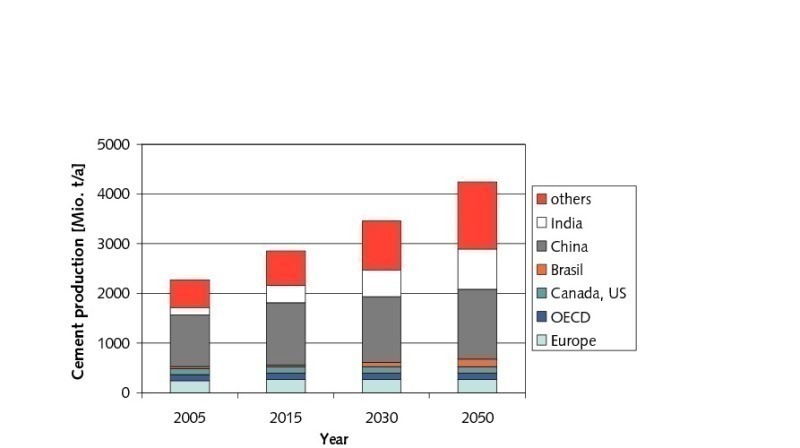 Against this background, the EU ultimately made the right decision in continuing to assign the CO2 certificates, in the framework of benchmarks, free-of-charge to the cement industry, and to other industries on the so-called Carbon Leakage List. This, however, is not to say that this will remain the case ad infinitum. The total quantity of CO2 certificates is, in any case, to be cut by 21 % by 2020 and the cement industry must, and certainly will, consider other methods of reducing CO2. The International Energy Agency has, on behalf of the G8 nations, drafted a Technology Roadmap which discusses the provisions necessary for long-term reduction of CO2 emissions in the cement sector. I don‘t agree with everything this study says, but it does make a number of interesting points. It is assumed, for example, that the global cement industry will be capable of reducing its CO2 emissions by 17 % by 2050, despite the fact that forecasts predict a more than 100 % increase in global cement production by that time (Fig. 3). Carbon Capture and Storage (CCS) is seen as an essential method of attaining this aim, and is claimed to be capable of contributing 56 % of the targeted decrease. Demonstration projects on this new technology are already being planned and prepared. But to reach the reduction target it would be necessary from 2025 onward to equip every new kiln with such a system, and that would involve enormous costs. I personally still have considerable doubts whether CCS technology will really achieve such importance.