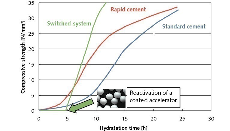 Prof. Ludwig: One important target is most certainly that of actively steering the system “concrete” in such a way that the required properties can be generated in a precisely chronologically defined sequence. Better understanding of cement hydration, and corresponding thermodynamic and kinetic models, are certainly important preconditions for this. Rational modeling will make it possible to discuss the range of instruments necessary for active control. One interesting concept in this context is the “activation” of hydrating systems, with the aim, after an application phase of any length whatsoever, of being able to initiate the hardening phase at a defined time by means of external or internal switches (Fig. 1).