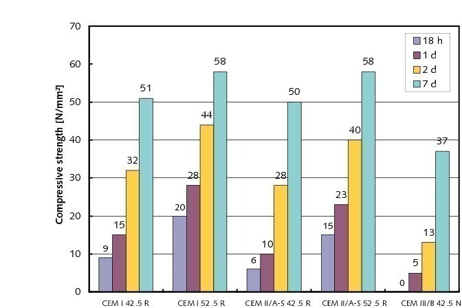 Prof. Ludwig: The study of alternative binder systems is a direct consequence of the CO2 controversy. The subject can, in principle, be subdivided into four focuses, all of which are under examination in Weimar. The first is concerned with the greatest possible reduction of the clinker factor by means of suitable composite materials. The most important challenge here is to maintain the traditional performance of a Portland cement even at high composite contents. The early and earliest strength of those cements can be problematic for their application in a precast plant (Fig. 4). However, a whole series of new conceptual solutions to increase reaction velocity of composite cements already exists. Another factor is the availability of reactive composites – analysis of the available quantities of these materials indicates a maximum realistic substitution rate of 35 %, and we are therefore also searching for alternative composite materials. We intend, for example, to determine whether calcined clays or modified converter slags can also be used.