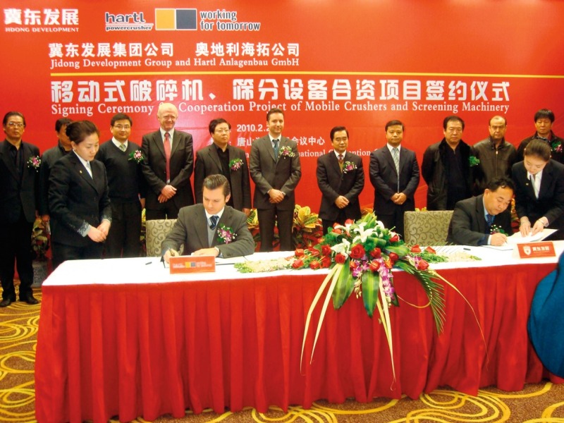 The Austrian manufacturer of crawler-mounted mobile screening and crushing plants, Hartl Anlagenbau GmbH, signed a cooperation agreement with the Chinese cement giant Dunshi of the Jidong Development Group Co. Ltd. in Tangshan/China on 23. February 2010. In the presence of prominent representatives from the economic and political sectors, a long-term cooperation was sealed (Fig.). This cooperation is based on a joint venture with the name “Hartl Jidong Crusher Manufacturing Limited Liability Company” with headquarters in Tangshan, Hebei Province, P.R. China. In the future, this 50/50 joint...
