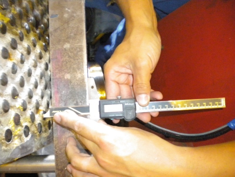 Blasting was used for preliminary cleaning of the rollers (Fig. 4), in order to remove remnants of slag and other fouling which had clogged the interstices between the metal carbide studs during mill operation. The mobile machining unit was then mounted in position, with one machining unit (Fig. 5) installed in front of the fixed roller and one machining unit in front of the movable roller. The alignment tolerance of this operation is 0.01 mm. The rollers were then appropriately measured, and the highest stud marked as a reference (Figs. 6 and 7).